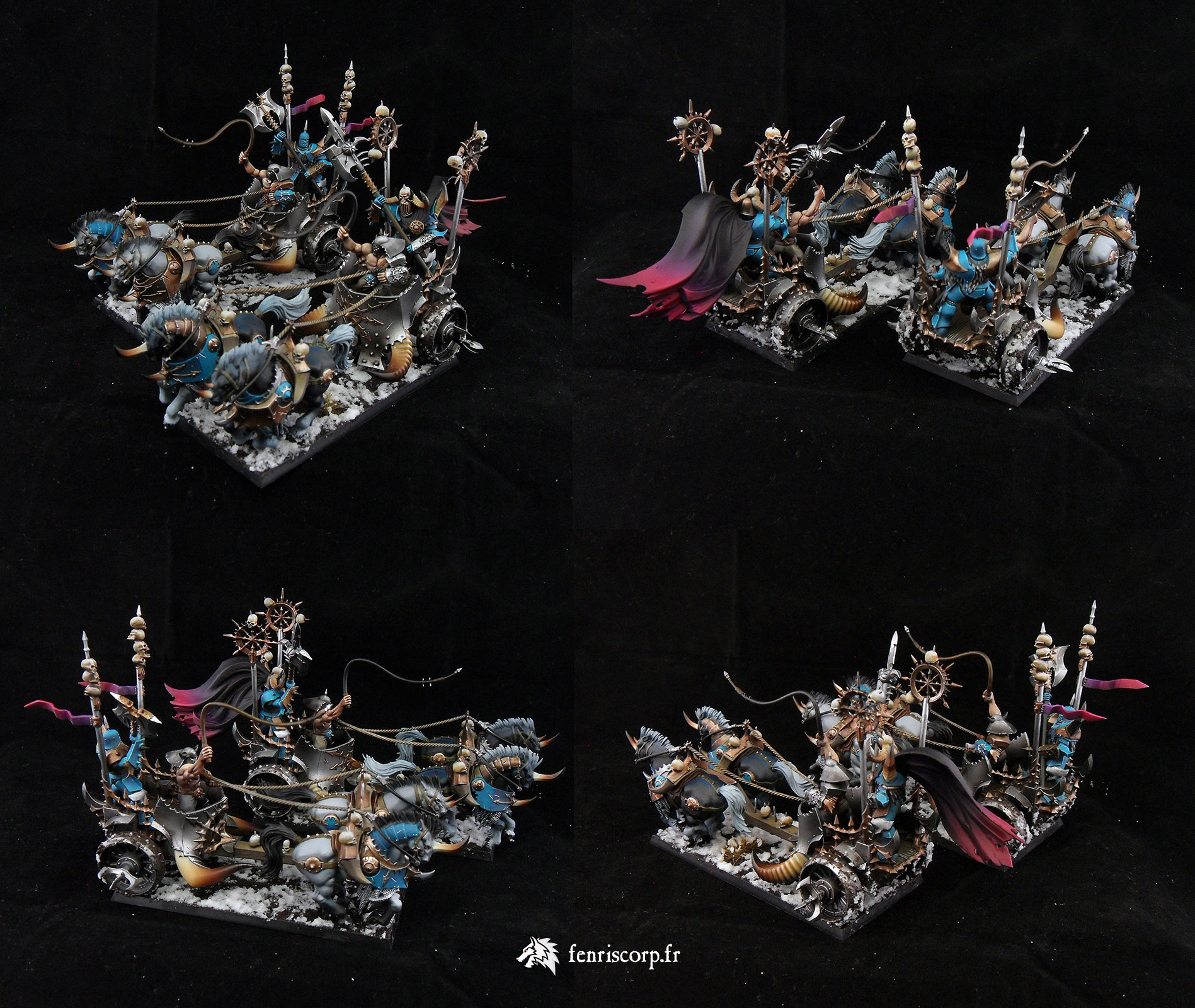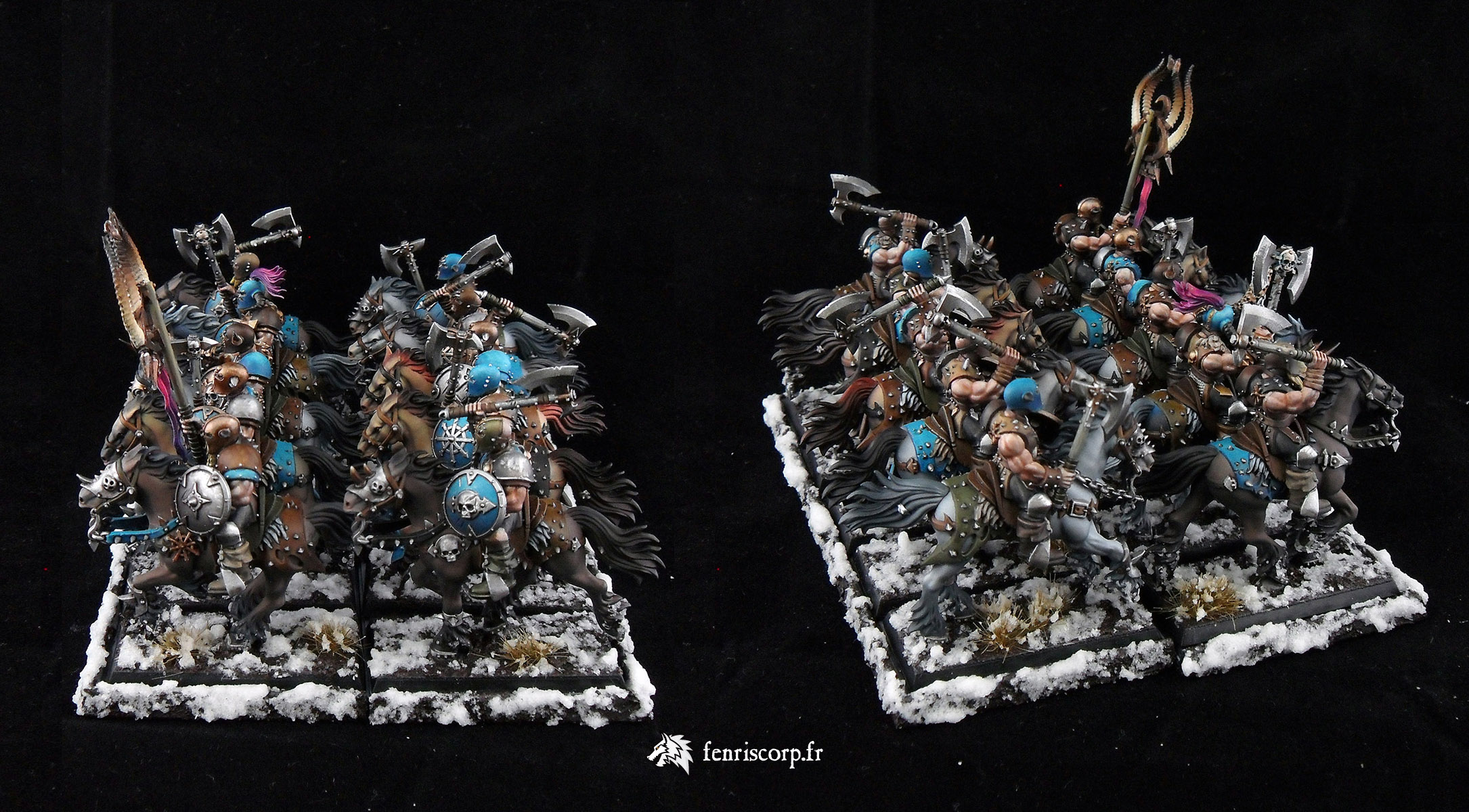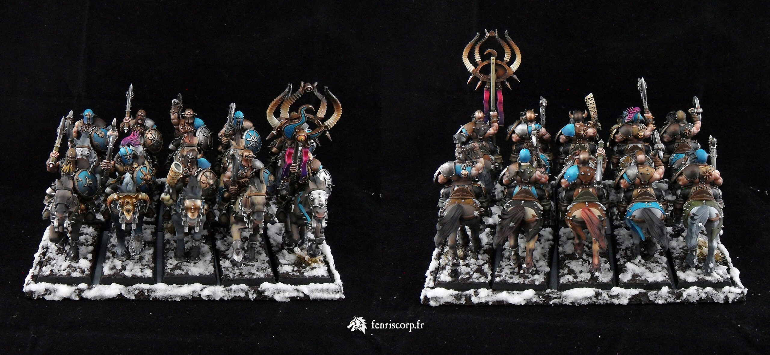 Une armée du Chaos réalisée il y a un moment pour compléter les premiers guerriers du Chaos schéma Tzeentch, au moment ou l’armée des Guerriers du Chaos s’enrichissait de références en plastique (maraudeurs sur bêtes de Slaanesh), qui ont été peintes en accord avec les couleurs du Dieu du Changement.
