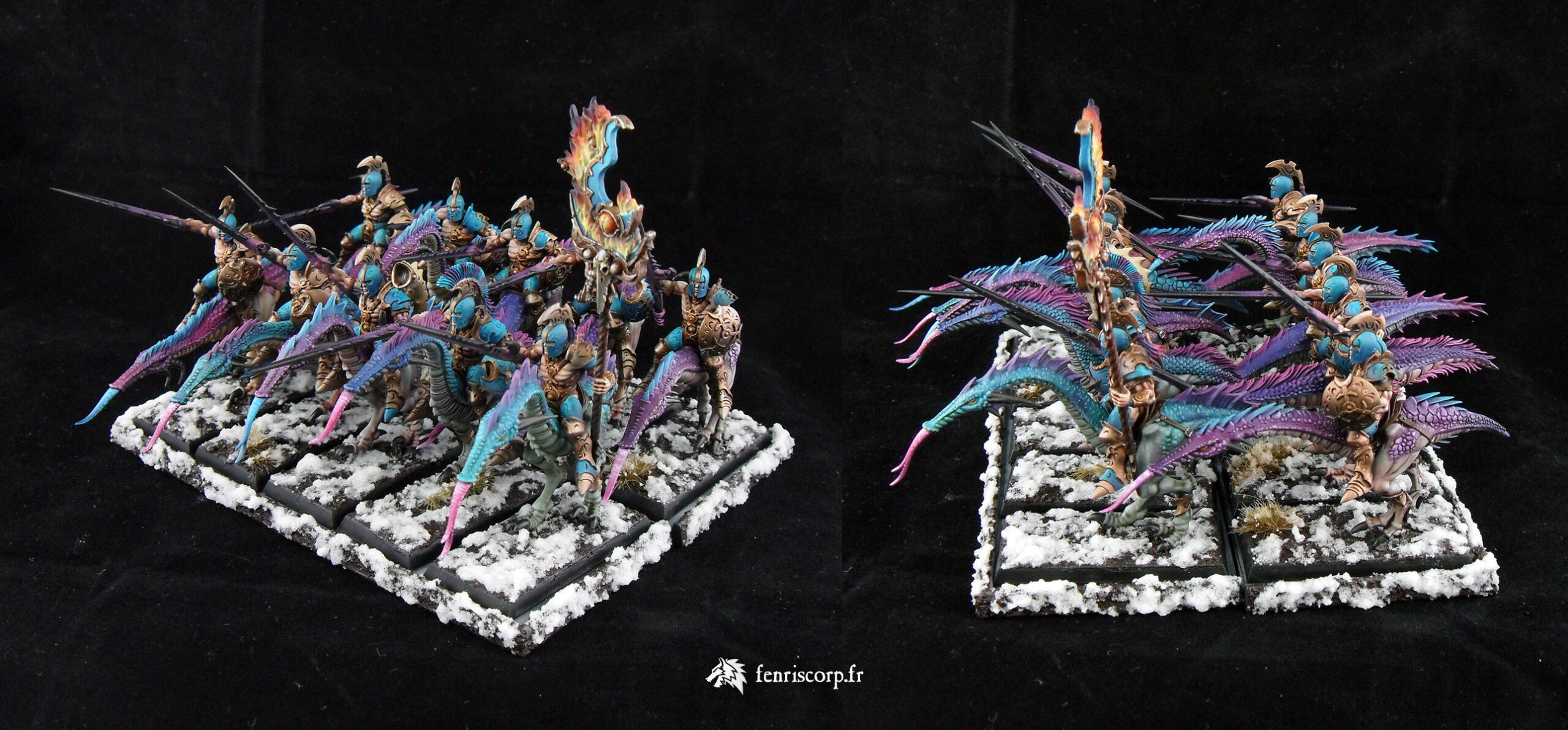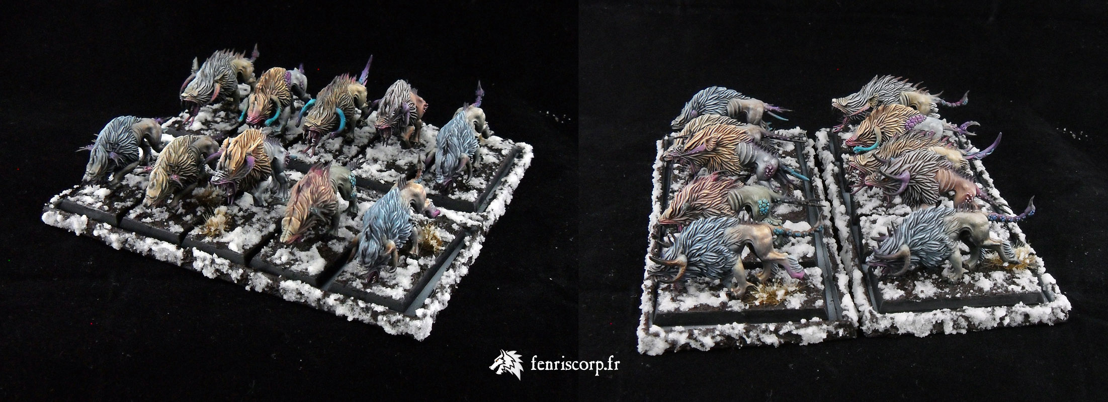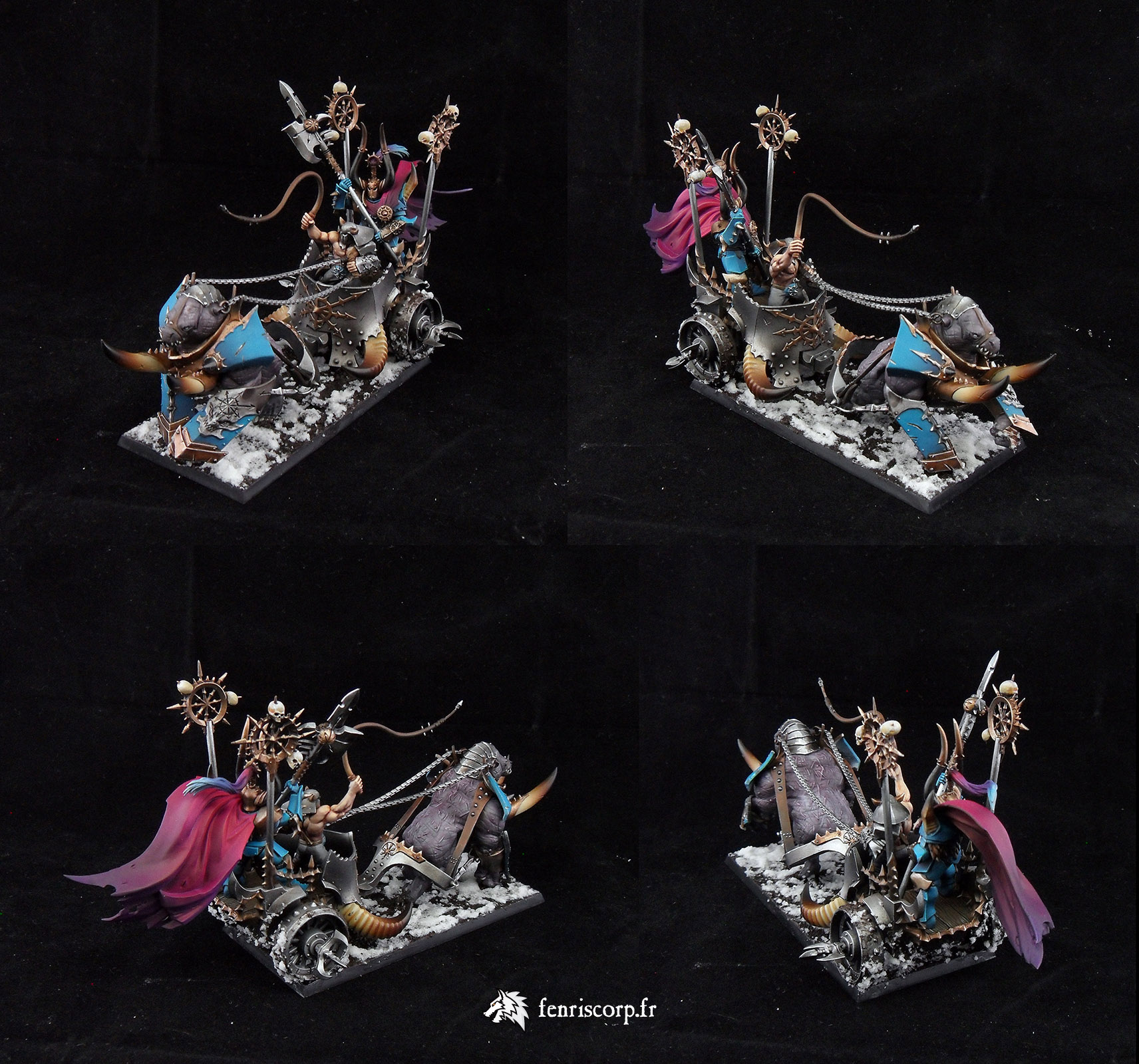 Une armée du Chaos réalisée il y a un moment pour compléter les premiers guerriers du Chaos schéma Tzeentch, au moment ou l’armée des Guerriers du Chaos s’enrichissait de références en plastique (maraudeurs sur bêtes de Slaanesh), qui ont été peintes en accord avec les couleurs du Dieu du Changement.